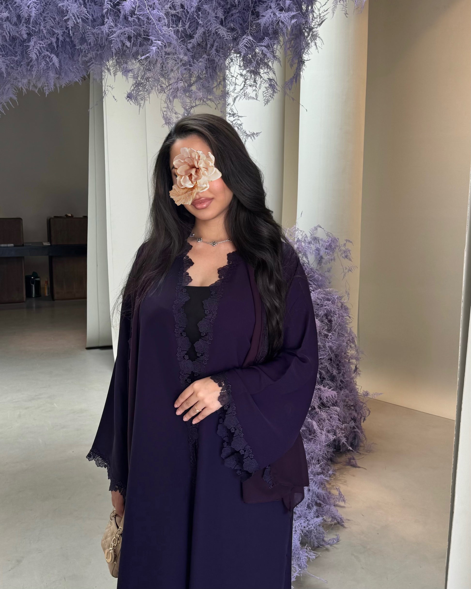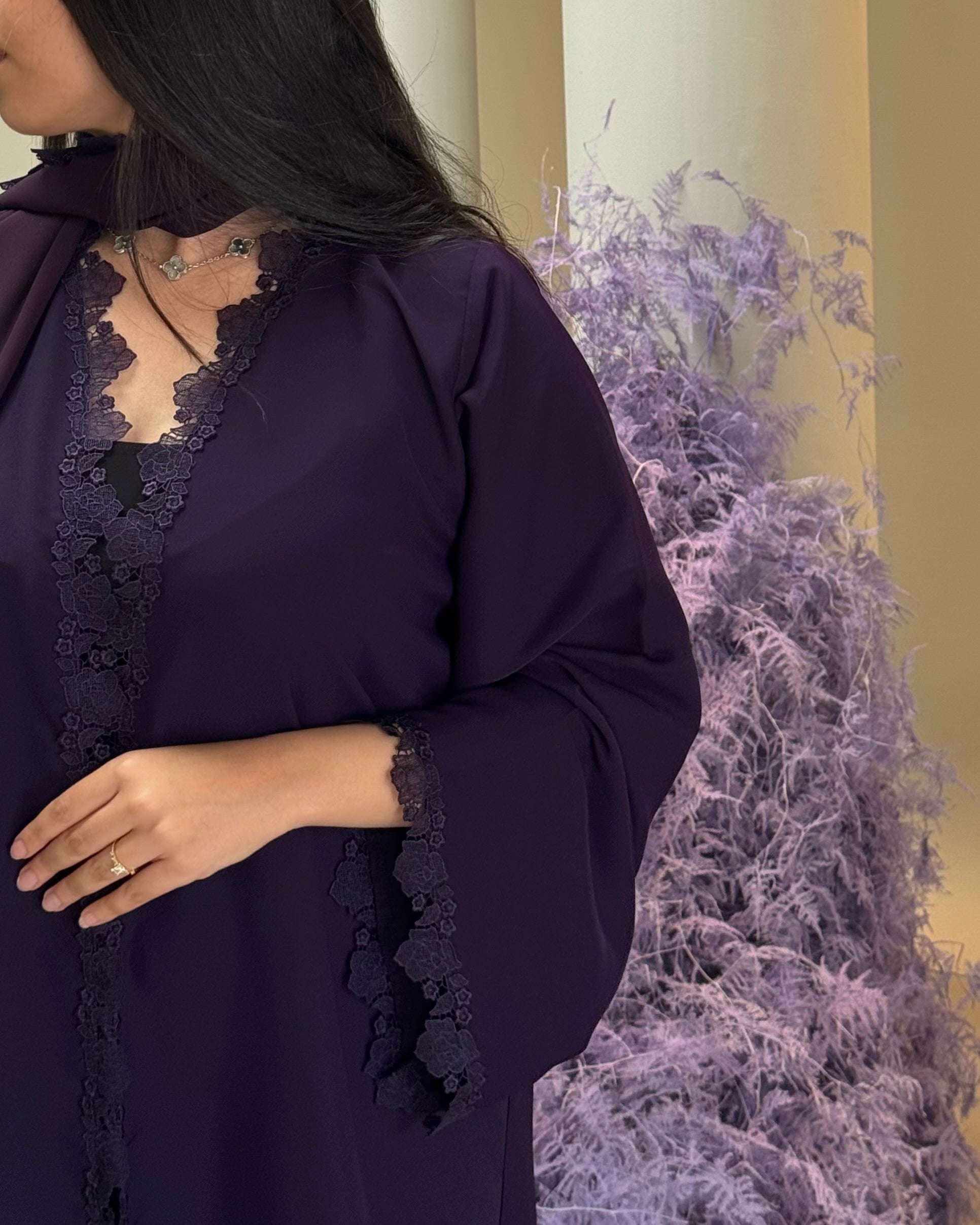 Deeply enchanting and gracefully bold—this dark purple abaya reimagines the charm of lavender in a richer, more regal shade. Designed in soft crepe fabric, it flows effortlessly while offering all-day comfort. The piece is adorned with delicate floral lace that traces the silhouette, adding a romantic touch of texture and femininity. Perfect for occasions where elegance speaks louder than words, this abaya blends timeless modesty with refined detail.